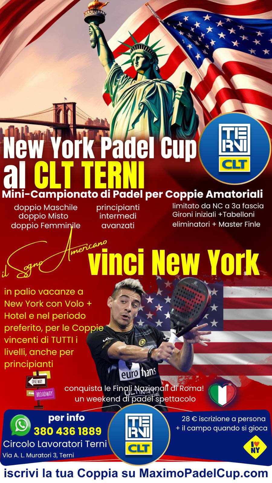 Il Circolo Lavoratori Terni presenta il nuovo torneo di Padel con in palio una straordinaria vacanza di 6 giorni a New York, comprensiva di volo e hotel, da utilizzare nel periodo a scelta.