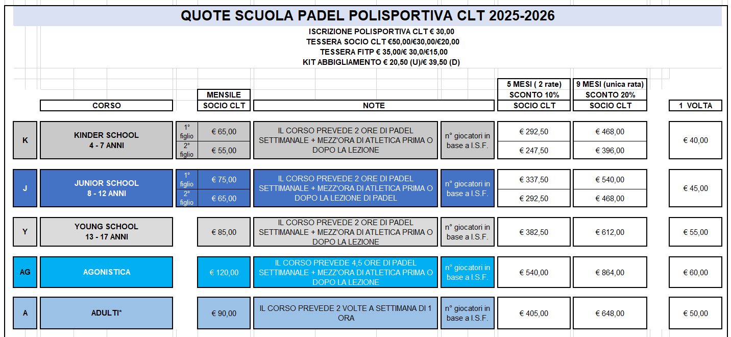 Quote iscrizione Sez. PADEL Polisportiva CLT